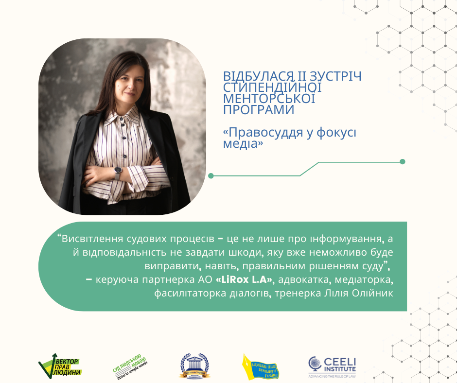 Нагадаємо, перша зустріч стипендійної менторська програма «Правосуддя у фокусі медіа» стартувала 17 грудня 2025 року, на якій відбулося знайомство учасників(-ць) та обговорено практичні кейси висвітлення судової тематики. Проєкт «Діалог між медіа та судовою владою для підвищення прозорості правосуддя» реалізується ГО «Вектор прав людини» у співпраці з Радою суддів України та Національною спілкою журналістів України за підтримки CEELI Institute (Прага).